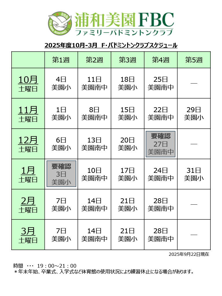 【ファミリーバドミントン】スケジュール2025下期 お知らせ 2025.09.22 ~2025年度 浦和美園FBCの下期のスケジュールが発表されました~ ダウンロード ・浦和美園FBC2025下期スケジュール(PDF:197 KB)